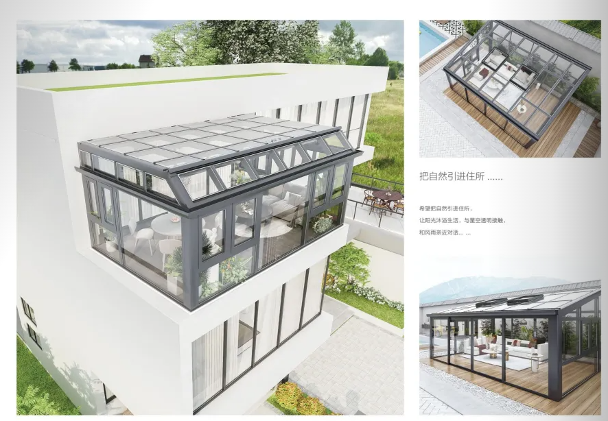 包括提升推拉门、折叠门、铝木复合门窗、隔热阳光房等,其中智能中空玻璃电动百叶系统为空间增添科技感与便捷性